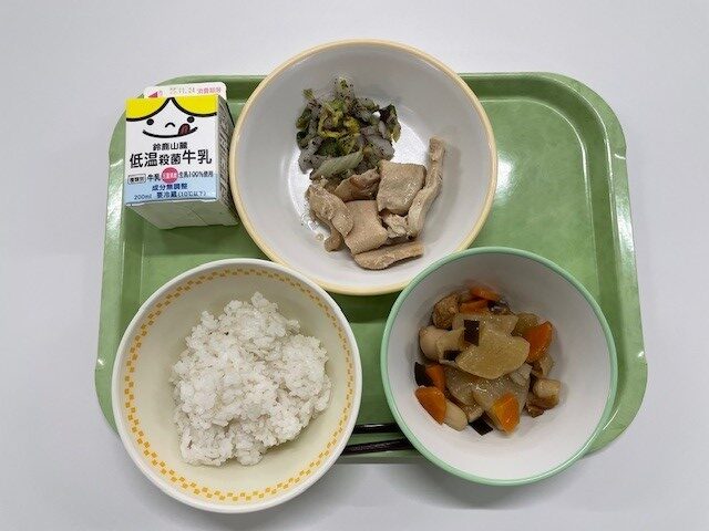 鶏肉の塩こうじ焼き、ゆかりあえ、関東煮、米飯、牛乳