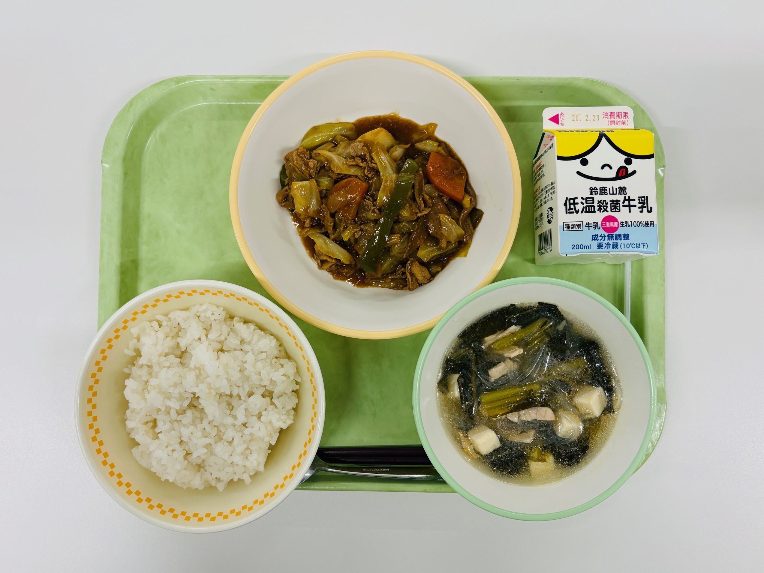 ホイコーロウ、サンラータン風スープ、米飯、牛乳