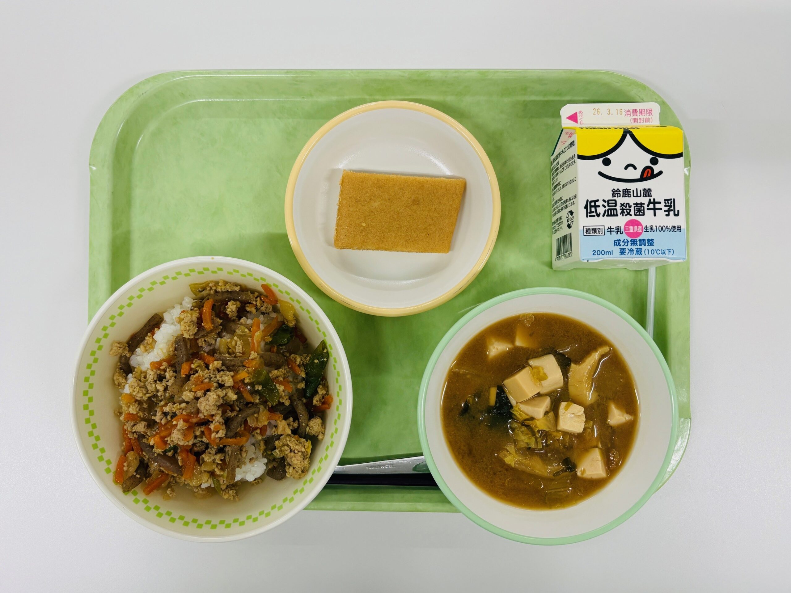 ほきの香味あげ、のりあえ、大根と里いものそぼろ煮、米飯、牛乳