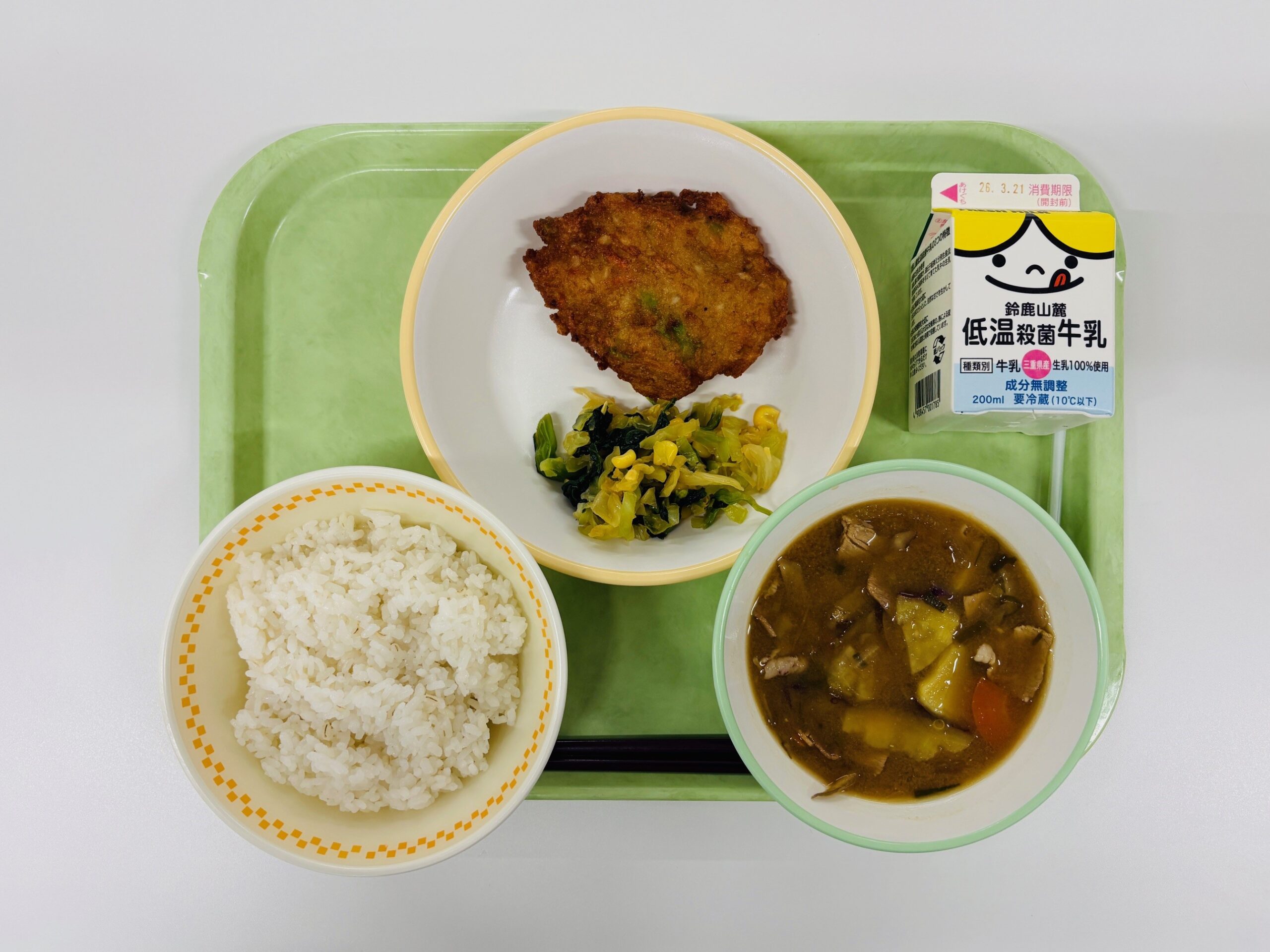 手作りさつまあげ、千草あえ、豚汁、米飯、牛乳