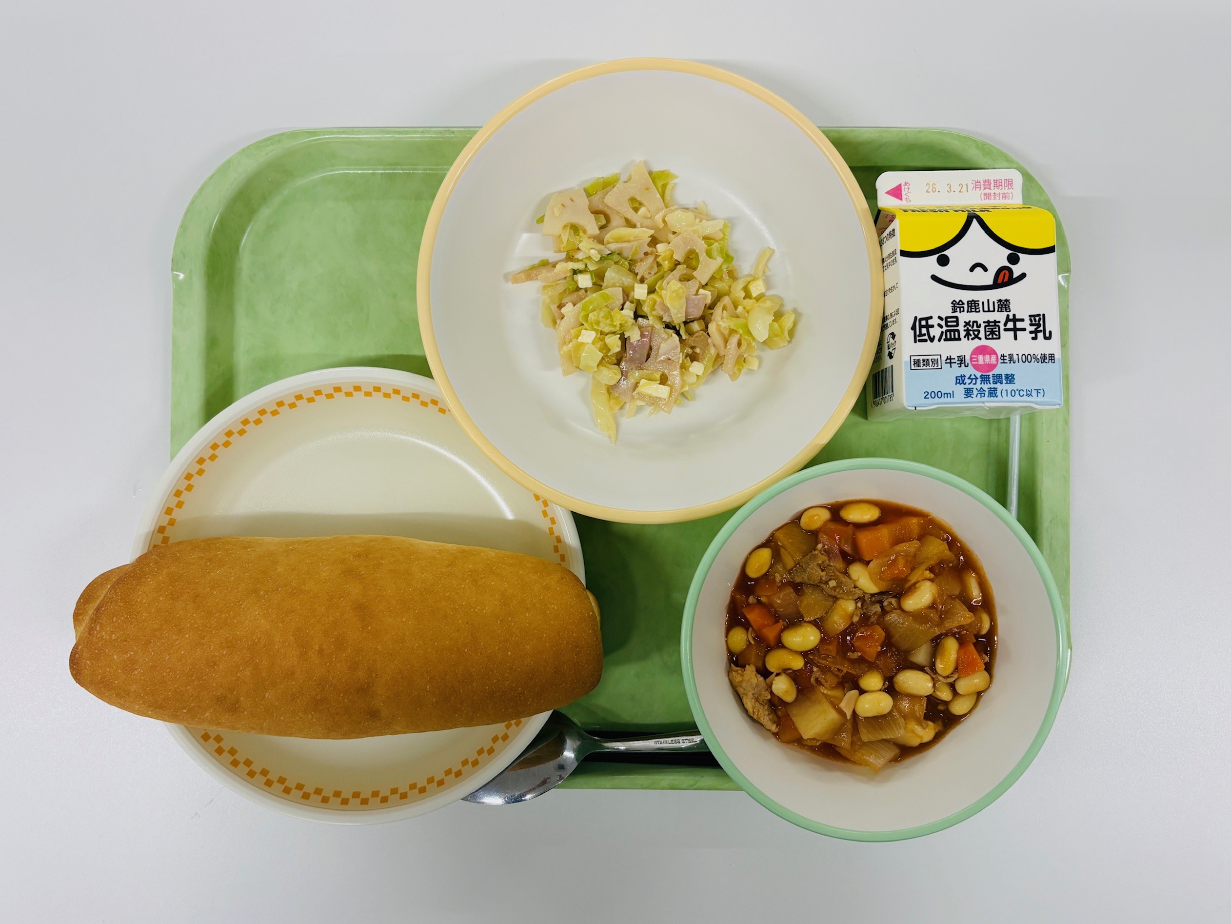 ポークビーンズ、チーズ入りれんこんサラダ、米粉パン、牛乳