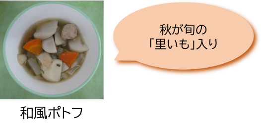 今日(AB班とも1日)の「和風ポトフ」には秋の味覚「里いも」が入っていました。おいしい旬の食べ物を楽しみましょう。