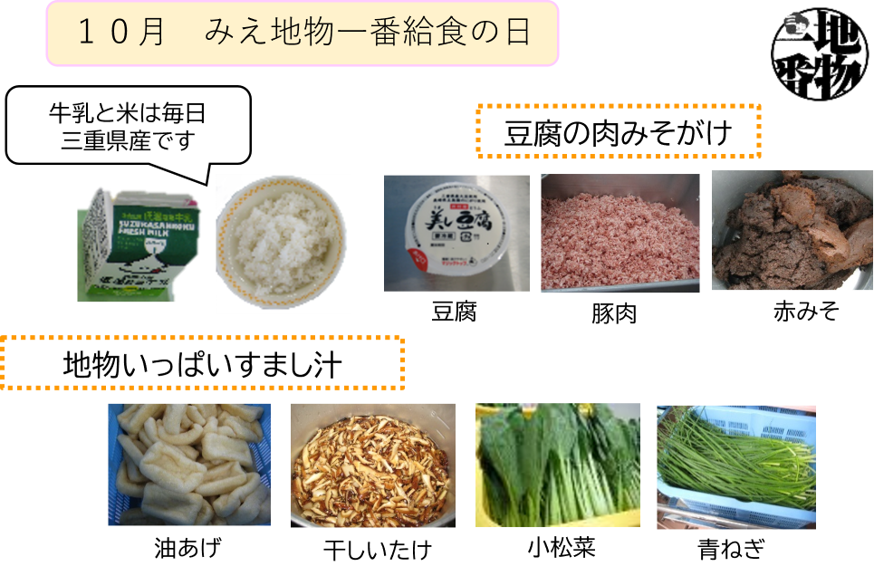 A班3日、B班2日はみえ地物一番給食の日です。今月の三重県産の食べ物は、米、牛乳、「豆腐の肉みそがけ」の豆腐、豚肉、みそ、「地物いっぱいすまし汁」の油あげ、干しいたけ、小松菜、青ねぎの9種類でした。