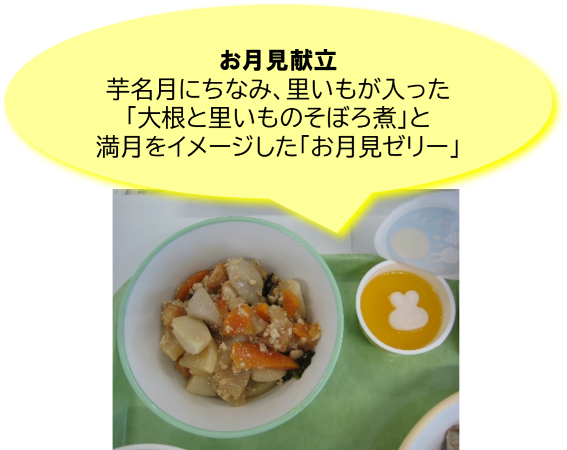 今日(ABとも6日)の給食は十五夜にちなんだ献立です。十五夜は「芋名月」とも呼ばれ、里いもなどのいも類をお供えして豊作を願う行事です。