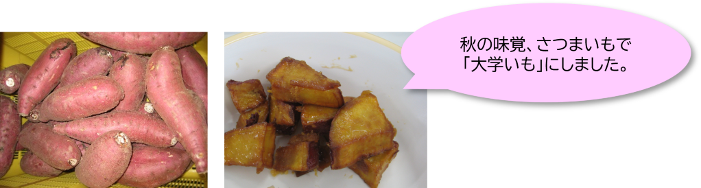 A班7日、B班8日は、「秋いっぱいメニュー」で、旬のさつまいもで作った「大学いも」でした。大学いもは甘辛い味付けで人気の献立です。