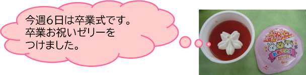 今日の給食(AB班とも2日)には卒業お祝いゼリーをつけました。給食も残りあと数日となりましたが、中学校での思い出を振り返りながら、給食を食べてくださいね。
