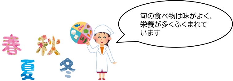 1年中出回っている食べ物と、旬の季節にとれたものを比べると、旬のものは味がよく、栄養が多く含まれています。