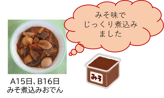 給食では、大根などの冬野菜やこんにゃく、うずら卵をみそ味でじっくり煮込んで作りました。地域の食文化を味わいましょう。