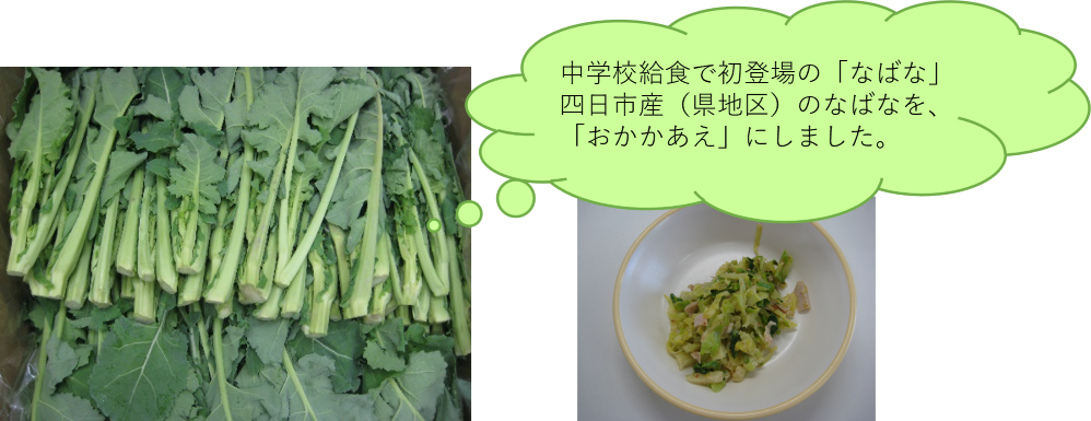 A班20日、B班21日の献立、「おかかあえ」に使用したなばなは、中学校給食では初登場の食材でした。なばなには風邪の予防や皮膚の健康に役立つビタミンCがほうれん草の約4倍も含まれています。またなばなに含まれるうまみ成分のグルタミン酸と、おかかに含まれるうまみ成分のイノシン酸が組み合わさると、おいしさが強く感じられます。