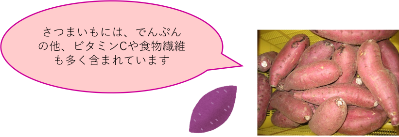 さつまいもは5群の食品で、でんぷんが多く含まれています。またビタミンCも豊富です。ビタミンCは加熱に弱い栄養素ですが、さつまいもに含まれるビタミンCはでんぷんがコーティングしてくれるため、加熱しても壊れにくいという他の野菜にはない特徴があります。また、お腹の調子を整える食物繊維も豊富です。