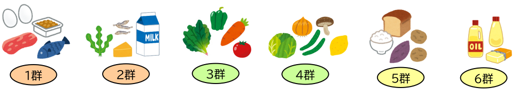 家庭科で学ぶ「6つの基礎食品群」にそろえて、給食の献立表には、食材を食品群ごとに掲載しています。