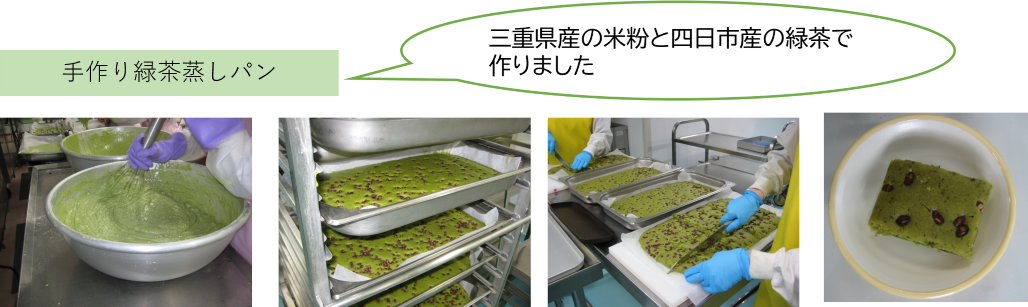7月ごろに行った「SDGsアンケート」で、知っている四日市市の食べ物は?という質問に、回答者約4300人中、3000人のみなさんが「お茶・かぶせ茶」と答えてくれました。献立の「手作り緑茶蒸しパン」は、水沢地区で作られたお茶を使った手作りの蒸しパンです。ほんのり甘い小豆と相性がいい蒸しパンです。