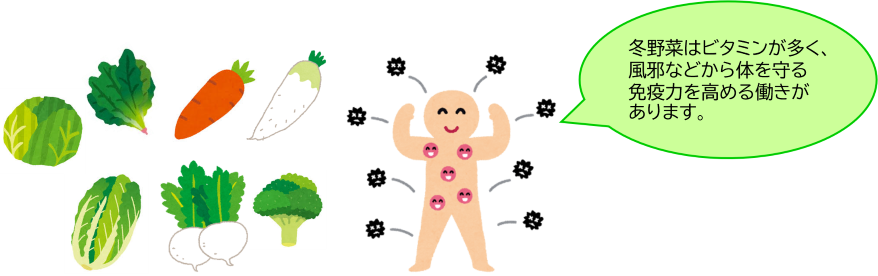 冬野菜には、今の季節に必要な、体を温めたり、免疫力を高めたりする働きがあります。