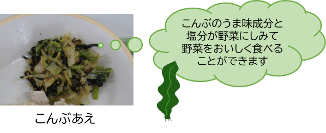 味つけに使っているこんぶは、うま味成分のグルタミン酸とアスパラギン酸を多く含む食材です。このうま味成分と塩分が野菜にしみて、野菜をおいしく食べることができます。こんぶは食物せんいやカルシウムも多く含んでいるので、日々の食事にとり入れるといいですね。