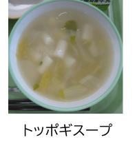 A班16日、B班17日の献立は韓国料理です。スープには、うるち米で作ったトッポギという韓国のおもちを使いました。