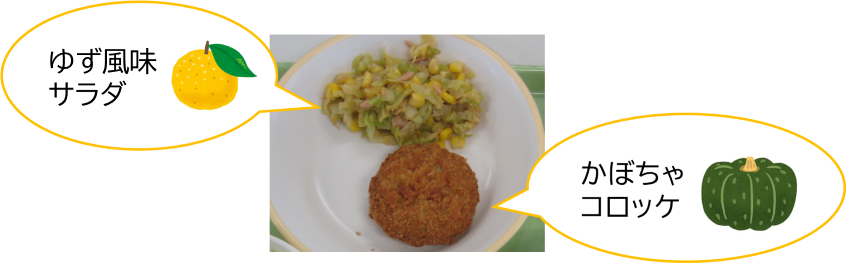 A班19日、B班18日は一足早く冬至にちなんだメニューとして、ゆず風味のドレッシングであえた「ゆず風味サラダ」と、「かぼちゃコロッケ」でした。12月22日の冬至には、ゆず湯に入ったり、「ん」が2回つく食べものを食べたりしてはいかかですか?