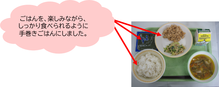 今日(ABとも26日)の「手巻きごはん」はごはんがしっかり食べられる工夫として、おにぎりのようにのりでごはんや具を巻いて楽しく食べるアイデアです。