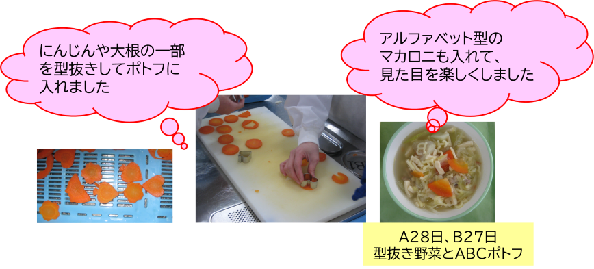 A班28日、B班27日の献立では、苦手な野菜等を楽しく食べられるように「ポトフ」の野菜の一部を型で抜いたり、アルファベットマカロニを使って見た目を楽しくする工夫を取り入れました。またパンにはジャムをつけて、パンが苦手な人も食べきれるようにしました。