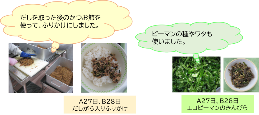 A班27日、B班28日の献立では、食品ロスを減らすための工夫がありました。