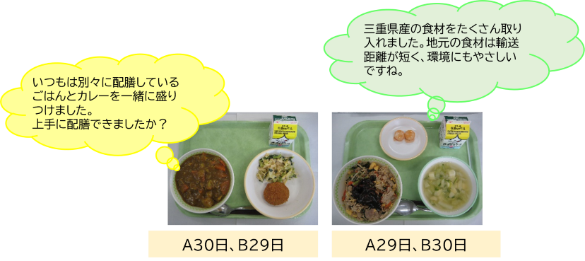 また、A班30日、B班29日のカレーライスは、いつもは米飯とカレーを別々に配膳していますが、今回は丼にご飯とカレーを一緒に盛り付けました。食器を1つにしたことで、洗い物に必要な水やエネルギーを節約できるアイデアです。