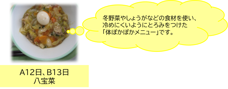 A班12日、B班13日の「八宝菜」は冬野菜である白菜をたっぷり使い、またしょうがの作用やとろみを利用した「体ぽかぽかメニュー」です。