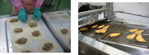 津ギョーザはたくさんの作業工程のあるメニューです。給食に間に合わせるために、調理員さんが朝早くからがんばって作ってくれました。野菜を洗う、切る、ギョーザのたねをこねる、たねを同じ大きさに分けて丸める、ギョーザの皮を並べる、皮でたねを包む、ギョーザを油で揚げるといった作業を分担して手際よく作ります。津ギョーザには、三重県産の豚肉を入れて作りました。