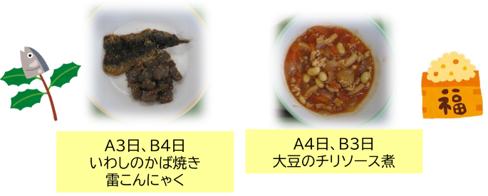 2月3日、4日の給食では、大豆、いわし、こんにゃくなど節分に関係のある食べものを取り入れました。