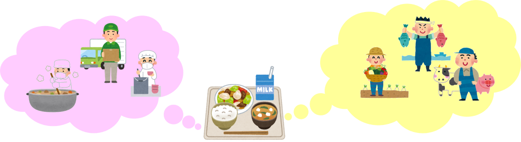 私たちの食事は、多くの人々の働きや努力によって支えられています。給食だけでなく、毎日の食事を作ってくれる人々のことや使われている食材がどのようにわたしたちのところまで届いているかなど想像してみましょう。わたしたちが食事のあいさつをしたり、残さず食べてきちんと後片づけをすることが、感謝をあらわすことにつながります。
