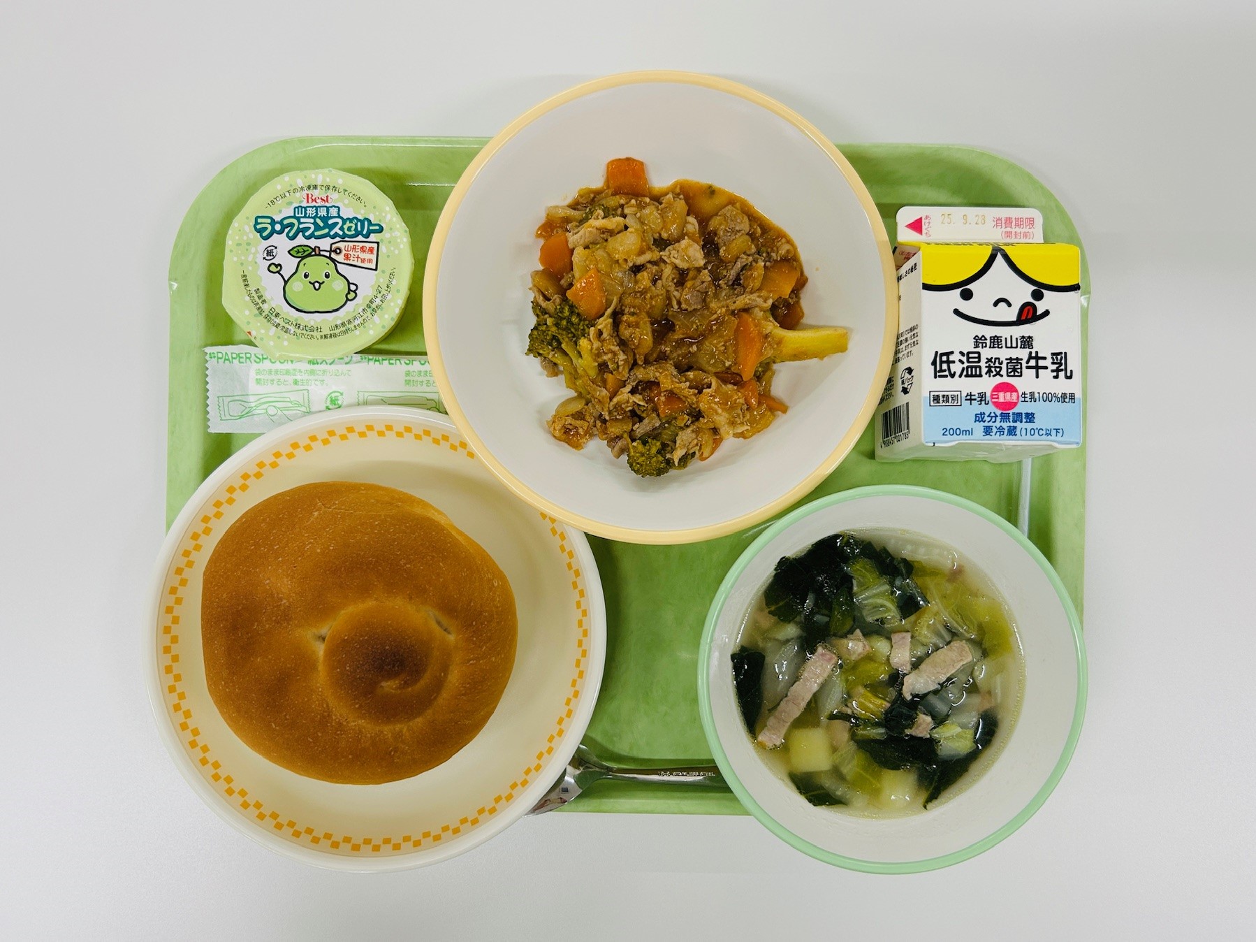ポークチャップ、野菜スープ、ラ・フランスゼリー、米粉パン、牛乳