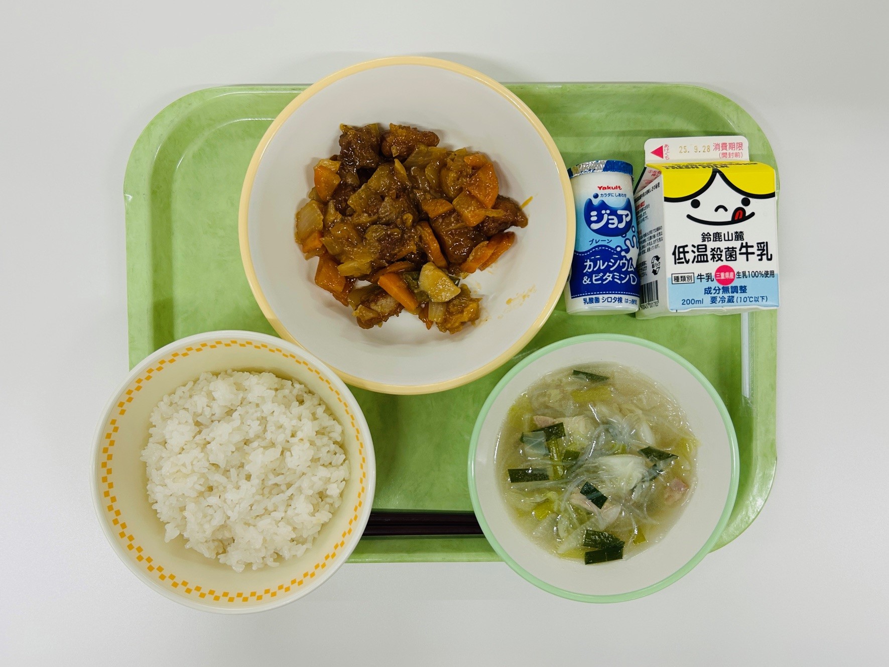 酢豚、春雨スープ、ミニはっこう乳、米飯、牛乳