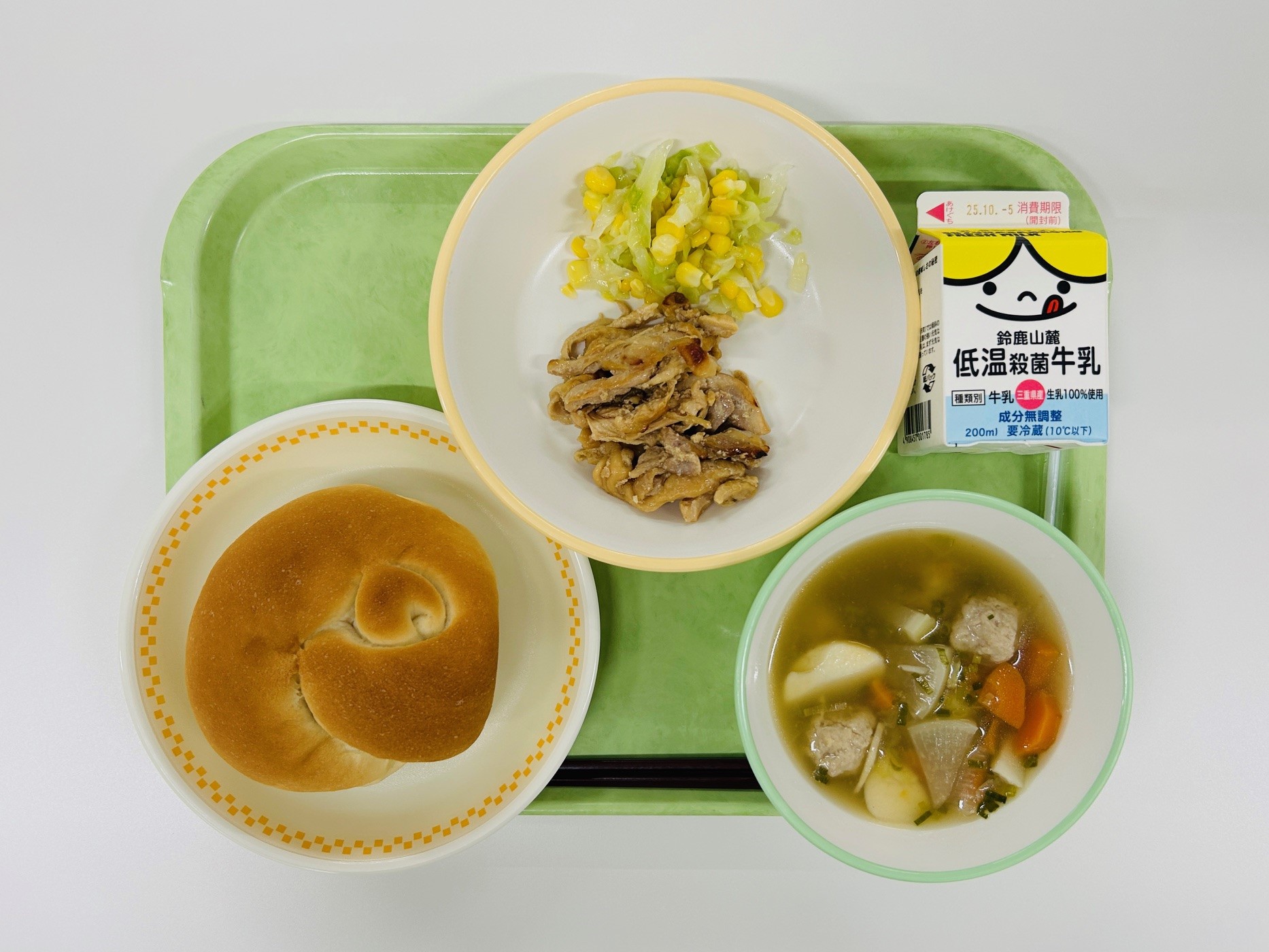 鶏肉の照り焼き、コールスローサラダ、和風ポトフ、米粉パン、牛乳
