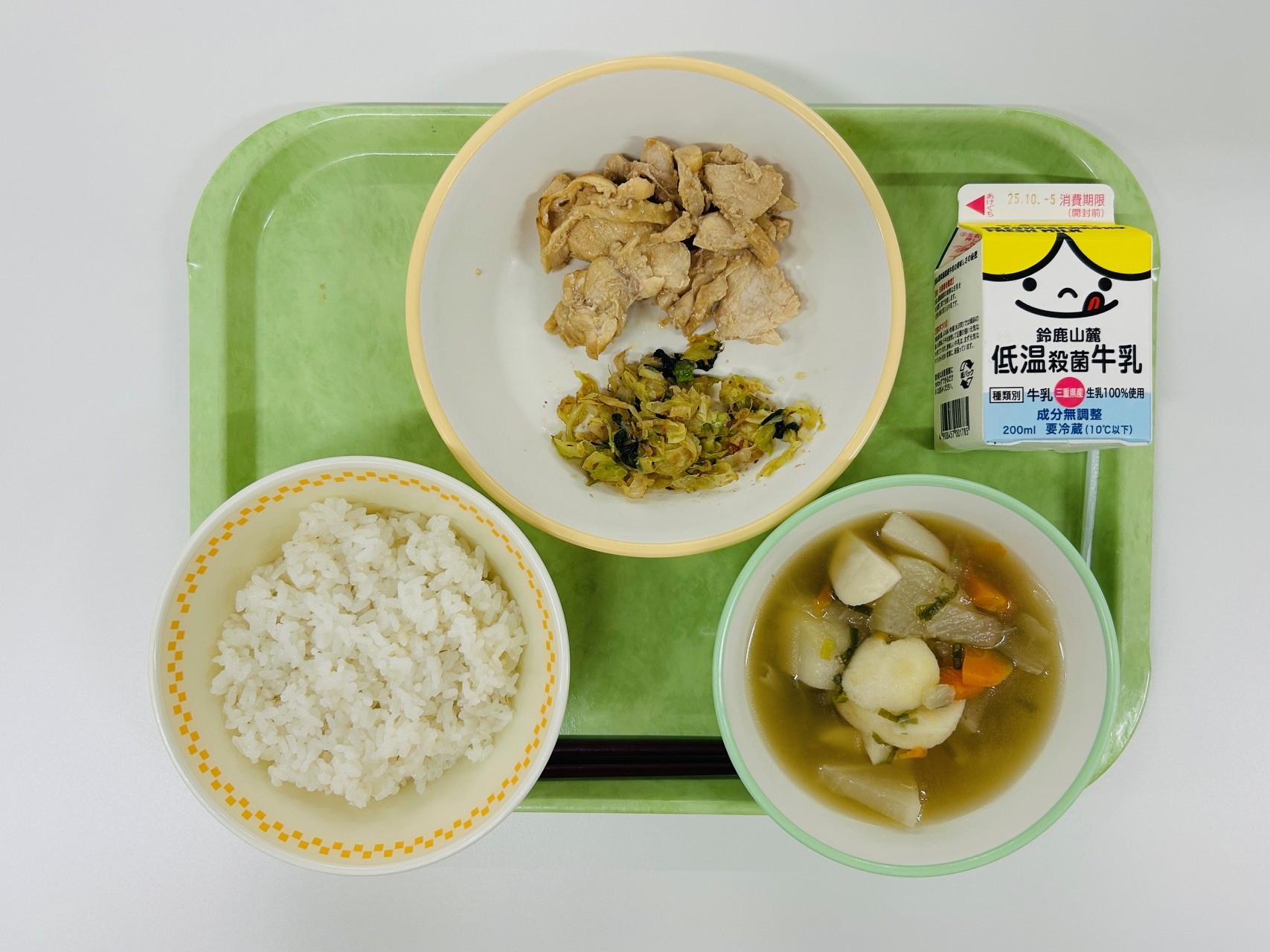 鶏肉の照り焼き、おかかあえ、和風ポトフ、米飯、牛乳
