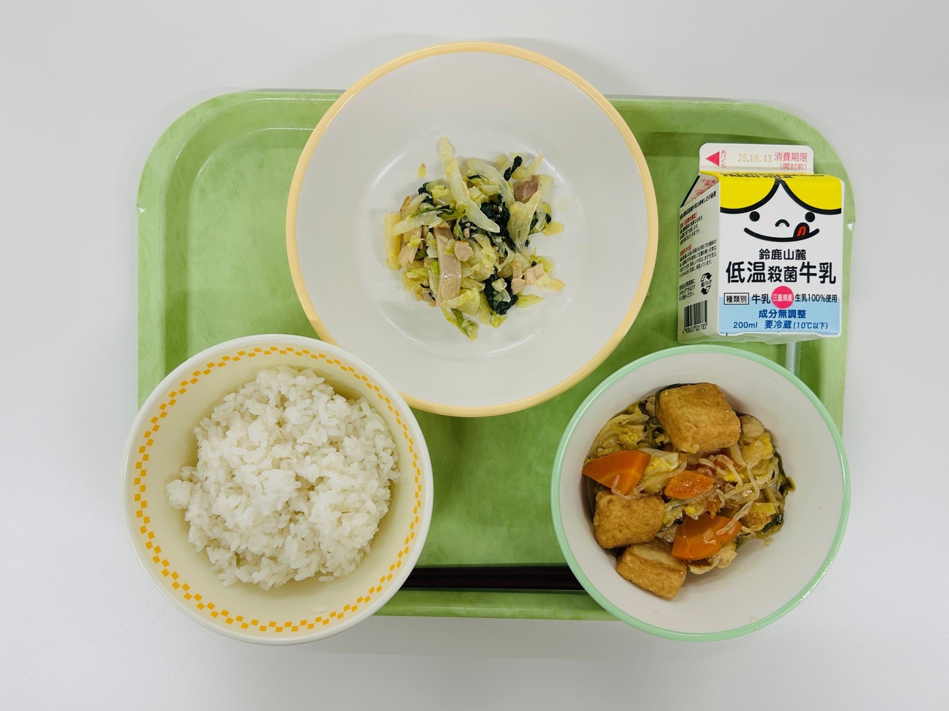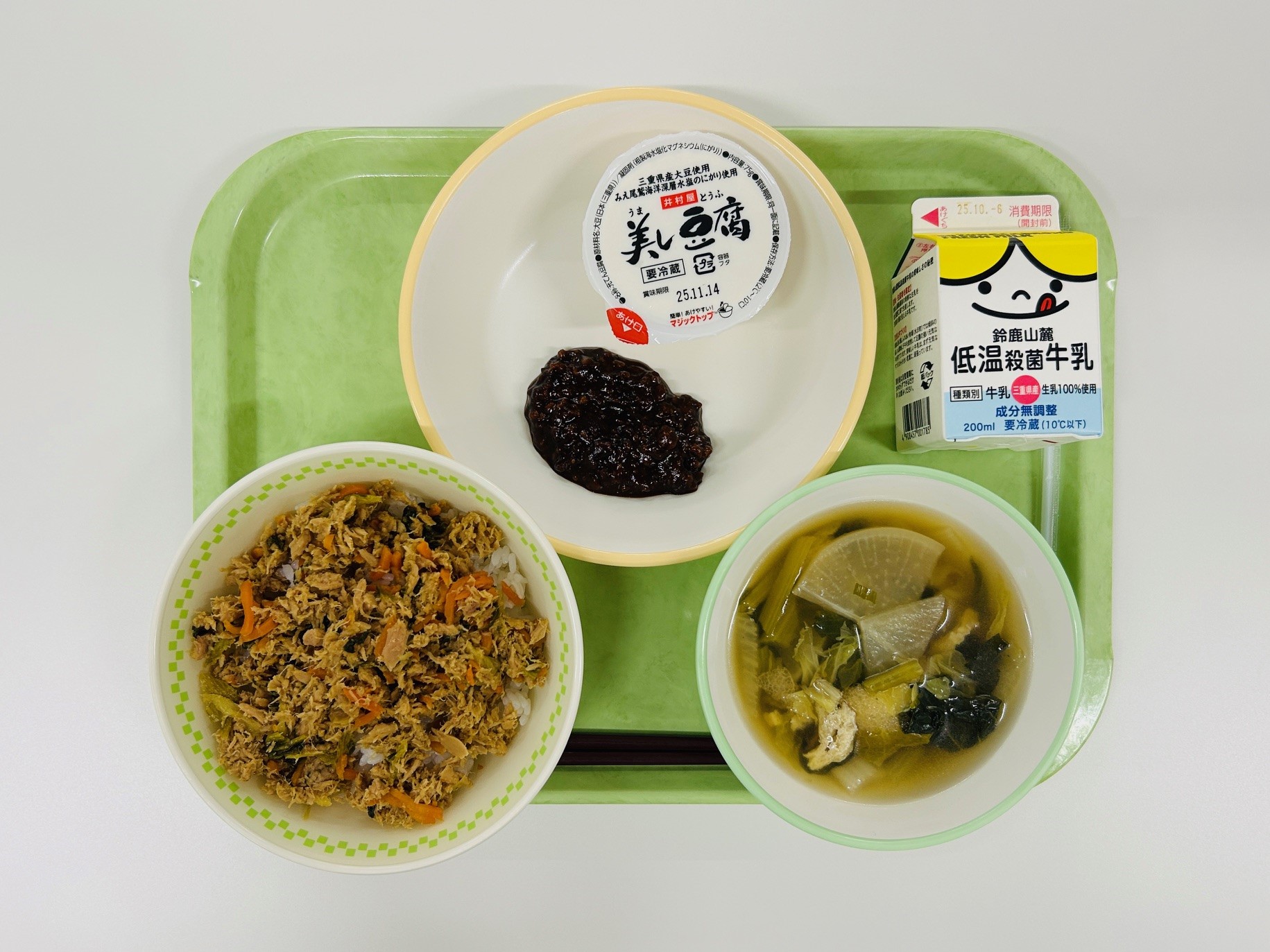 ツナ丼、豆腐の肉みそがけ、地物いっぱいすまし汁、牛乳