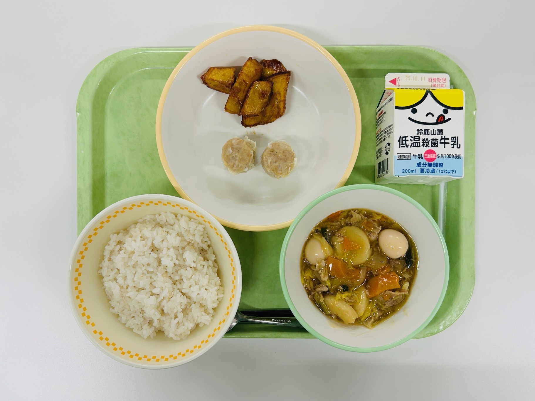八宝菜、シュウマイ、大学いも、米飯、牛乳