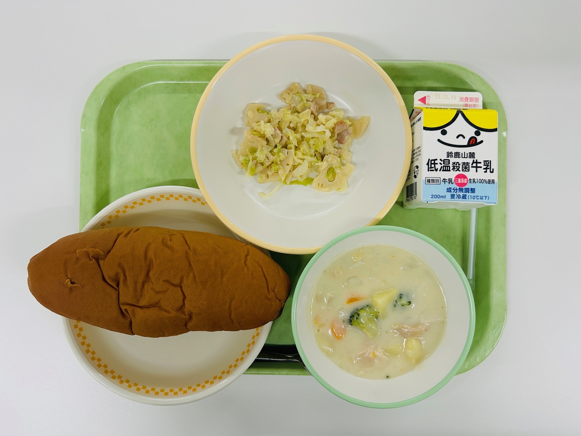 クリームシチュー、れんこんサラダ、黒糖パン、牛乳