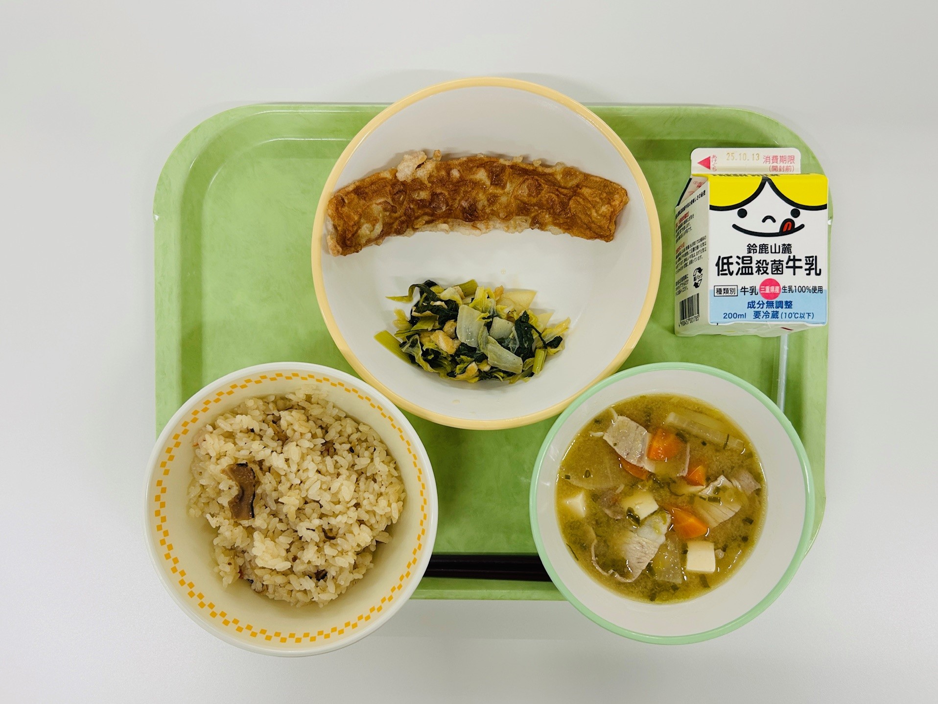 【大阪】ちくわの紅しょうが天、小松菜の炊いたん、粕汁、かやくごはん、牛乳