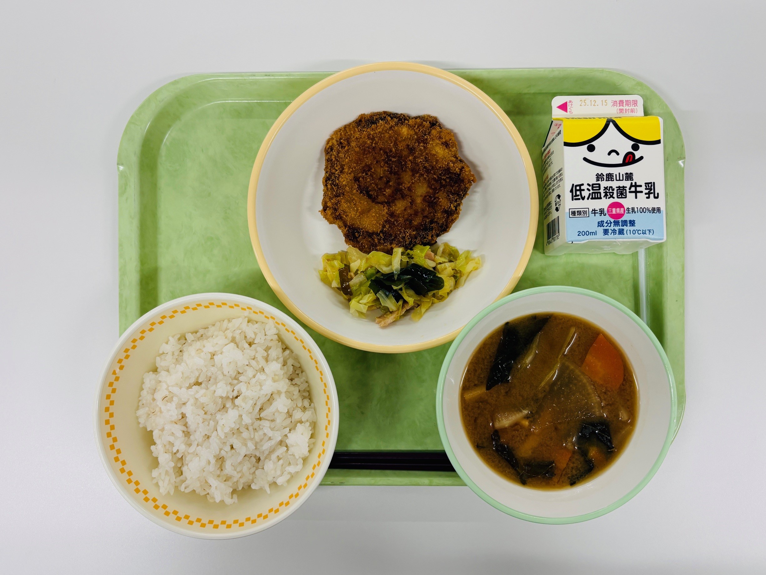 手作りれんこんメンチカツ、海そうサラダ、みそ汁、米飯、牛乳