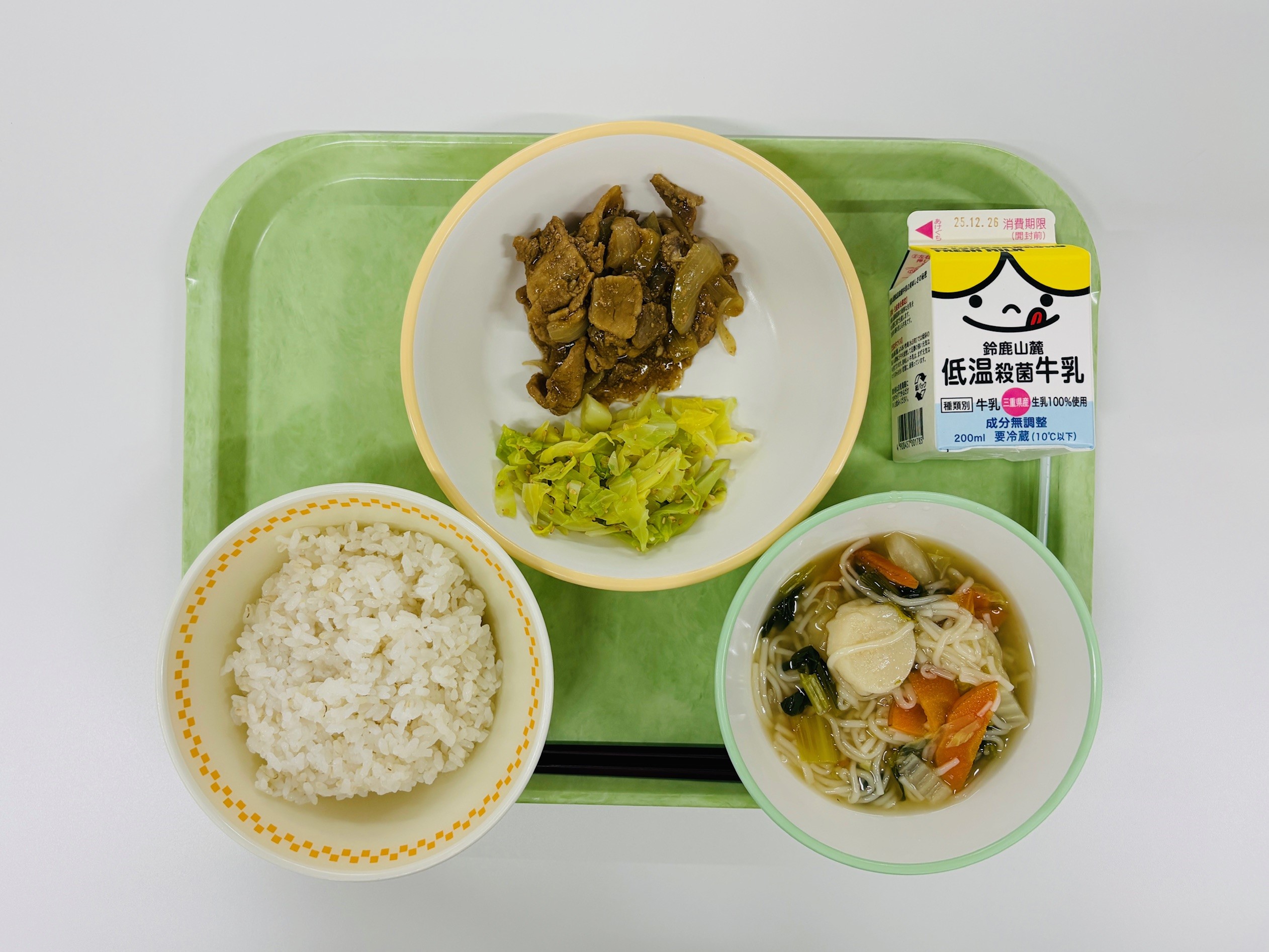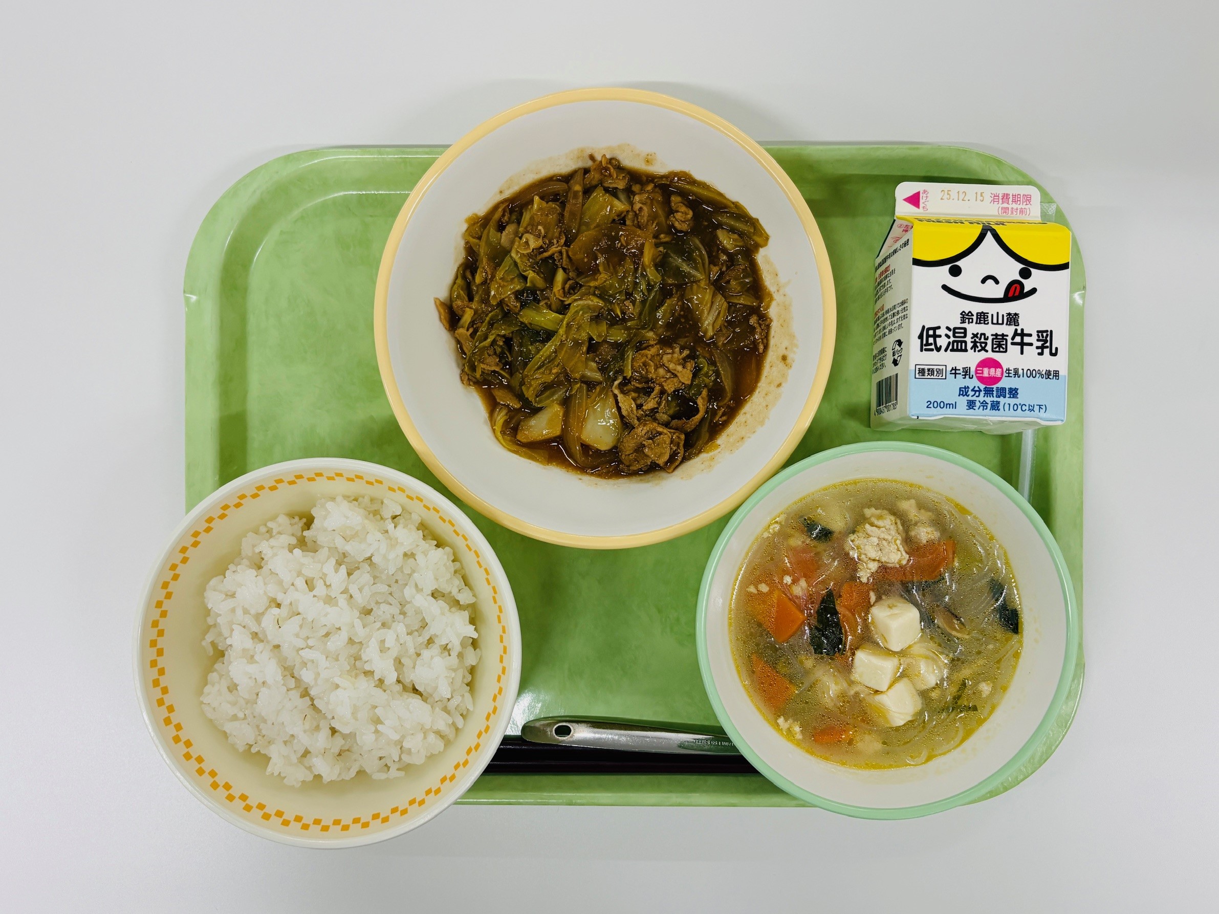 ホイコーロウ、春雨スープ、米飯、牛乳