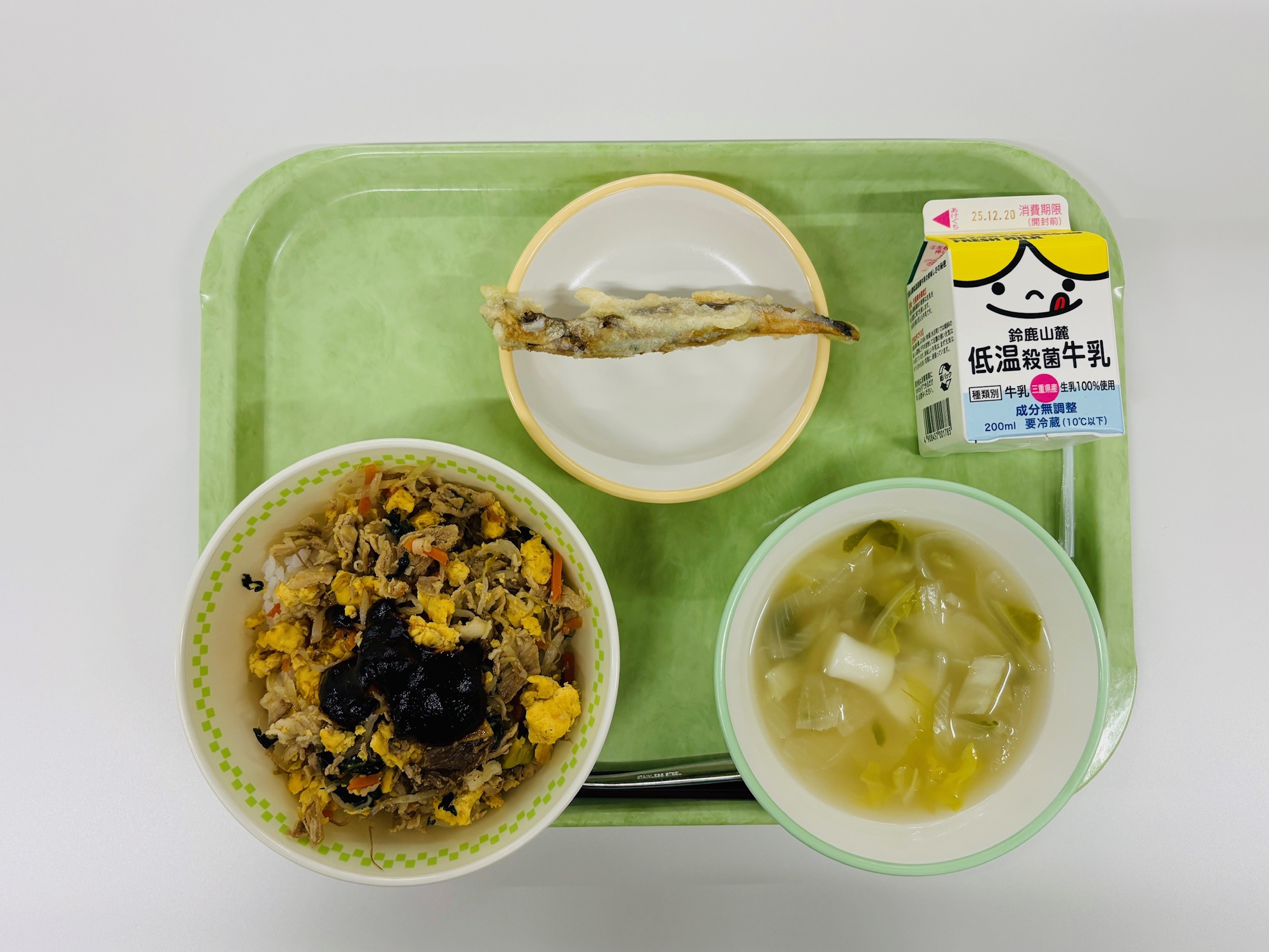 ビビンバ、ししゃもの天ぷら、トッポギスープ、牛乳