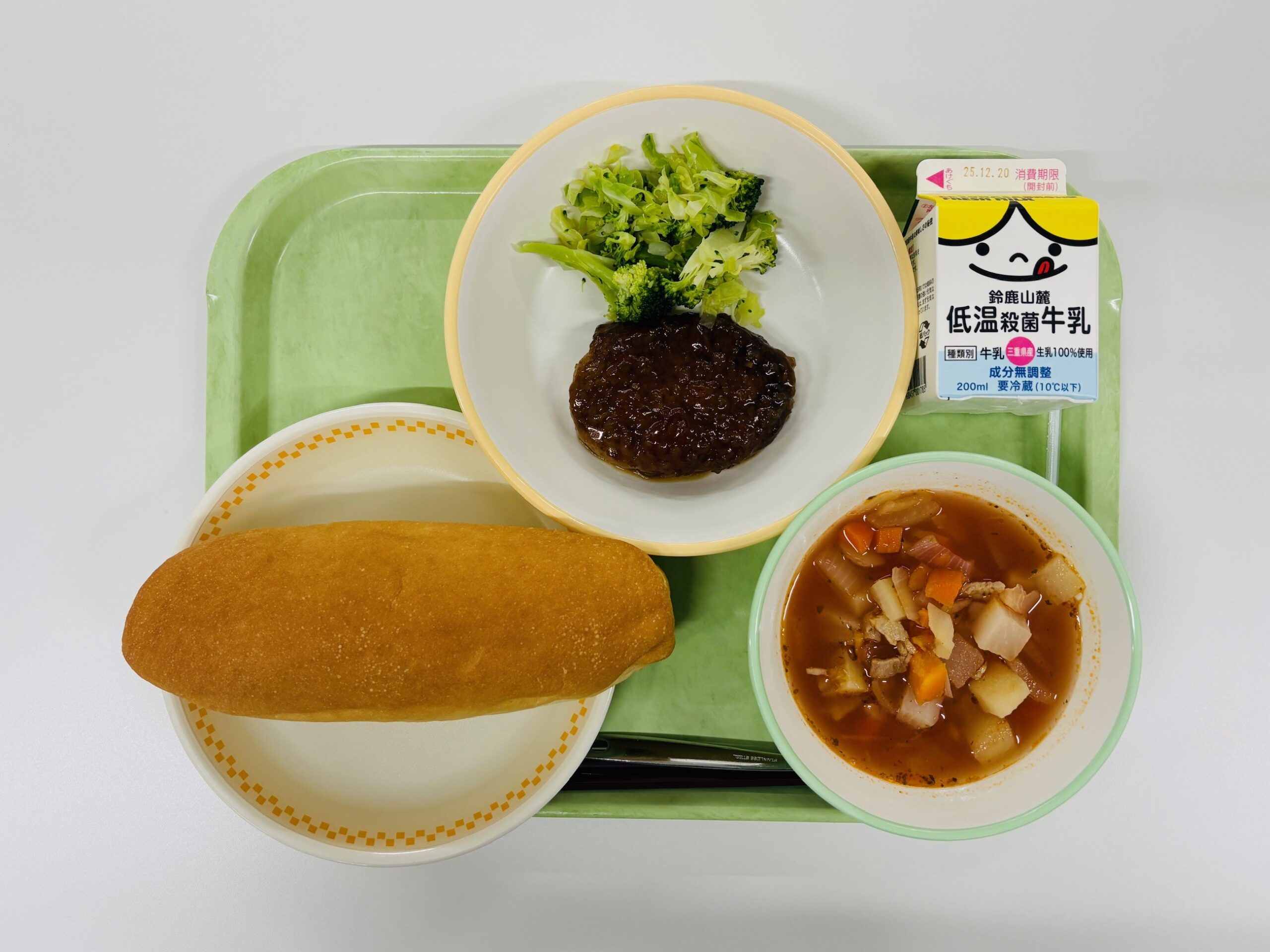 ハンバーグオニオンソース、ゆで野菜、ミネストローネ、米粉パン、牛乳