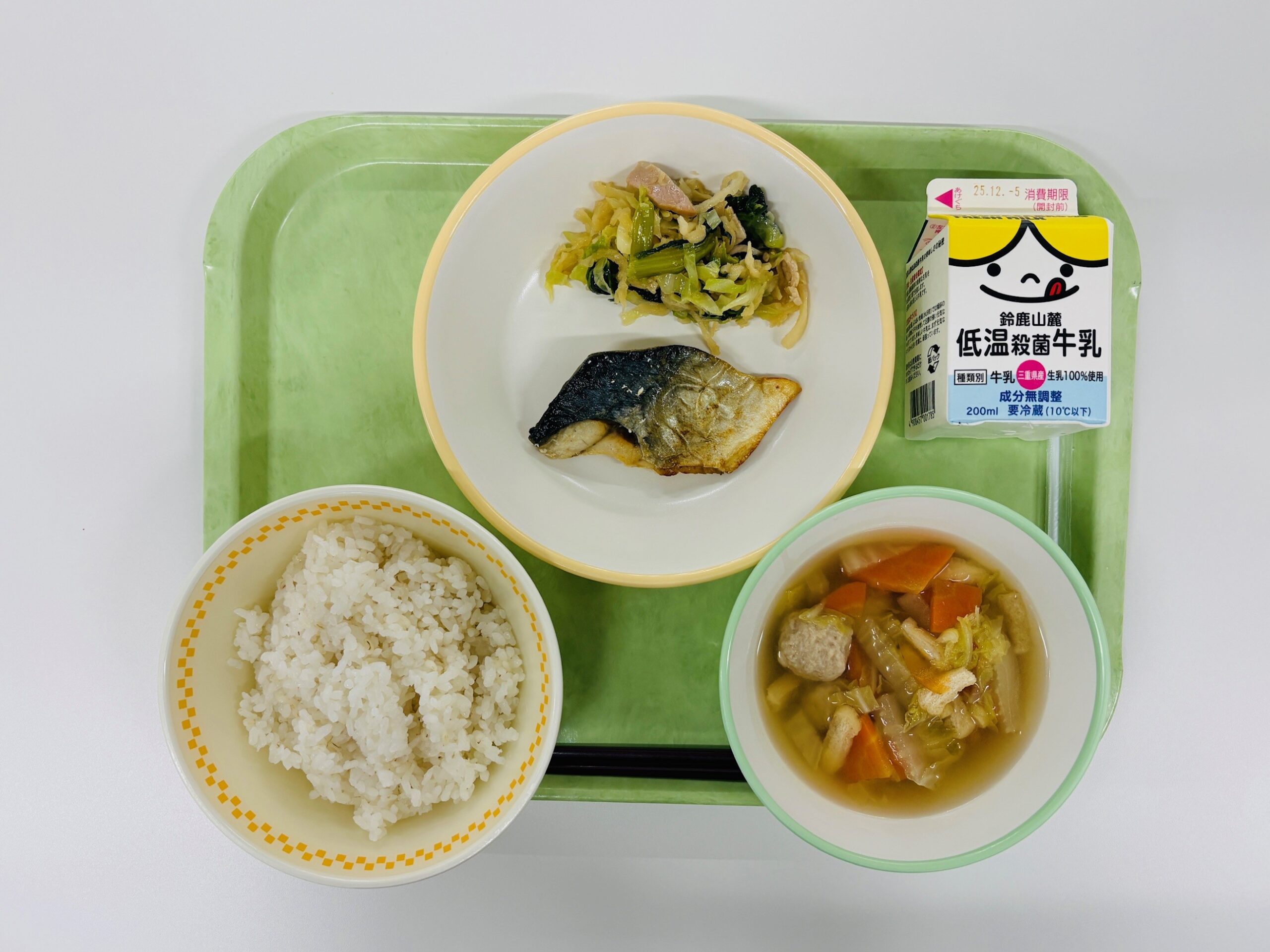 さばの塩焼き、切干大根のサラダ、鶏だんごのすまし汁、米飯、牛乳
