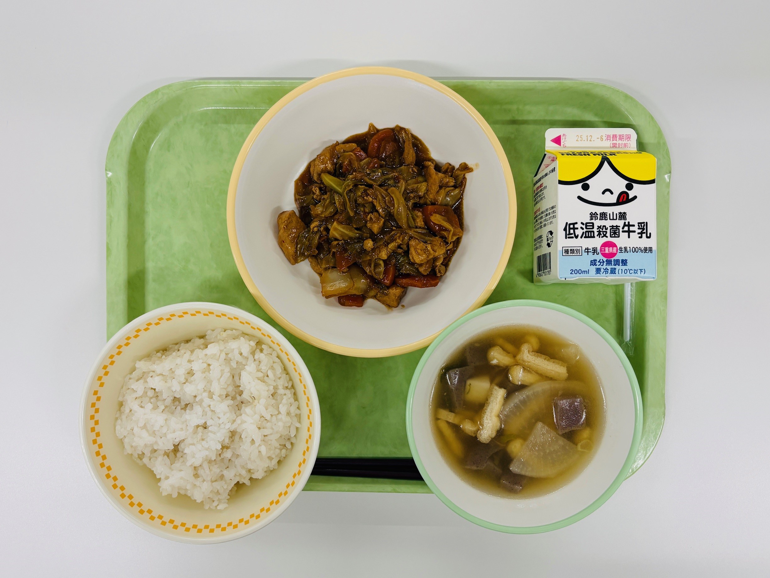 鶏ちゃん、のっぺい汁、米飯、牛乳