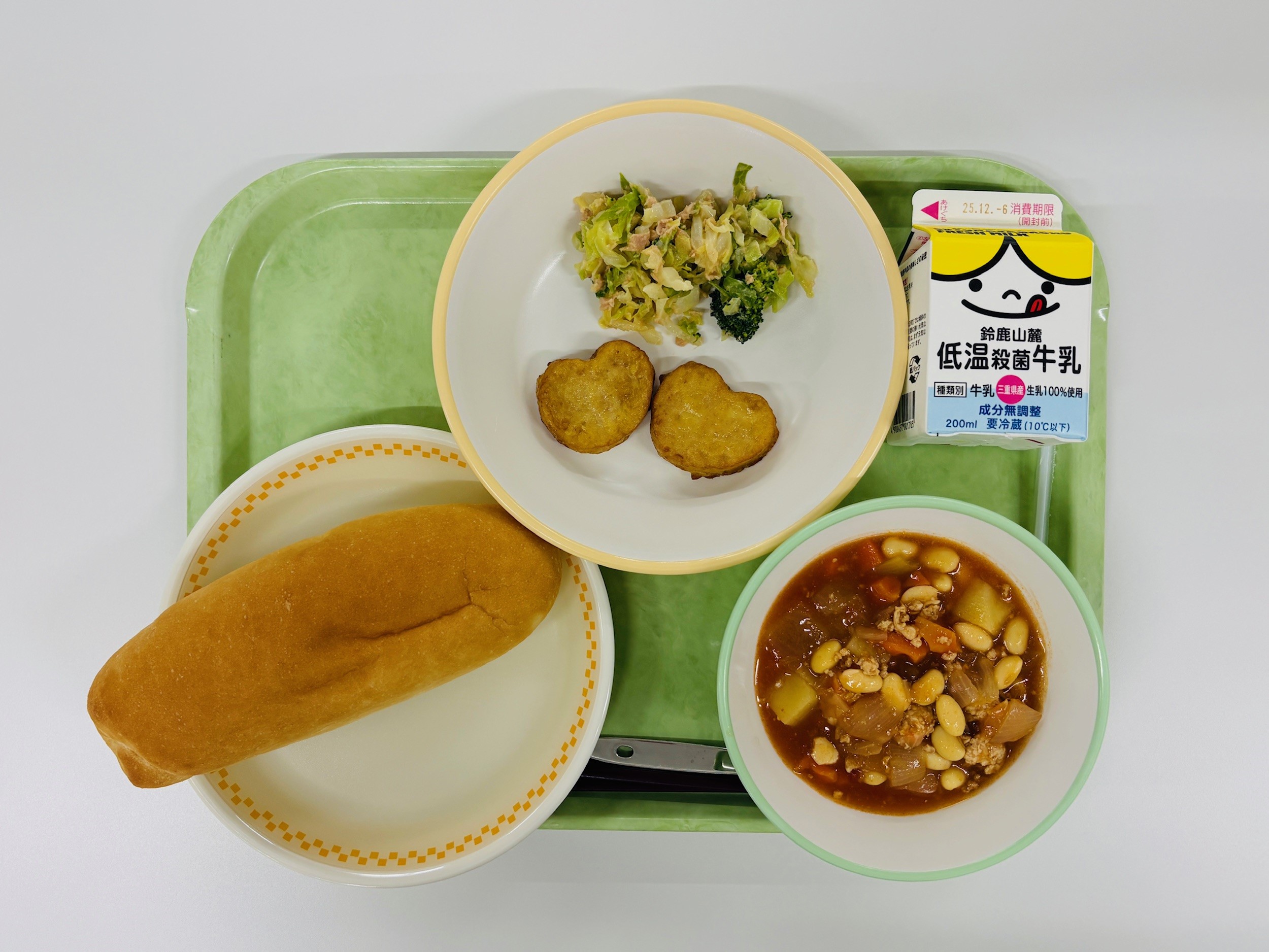 大豆のチリソース煮、チキンナゲット、ブロッコリーサラダ、米粉パン、牛乳
