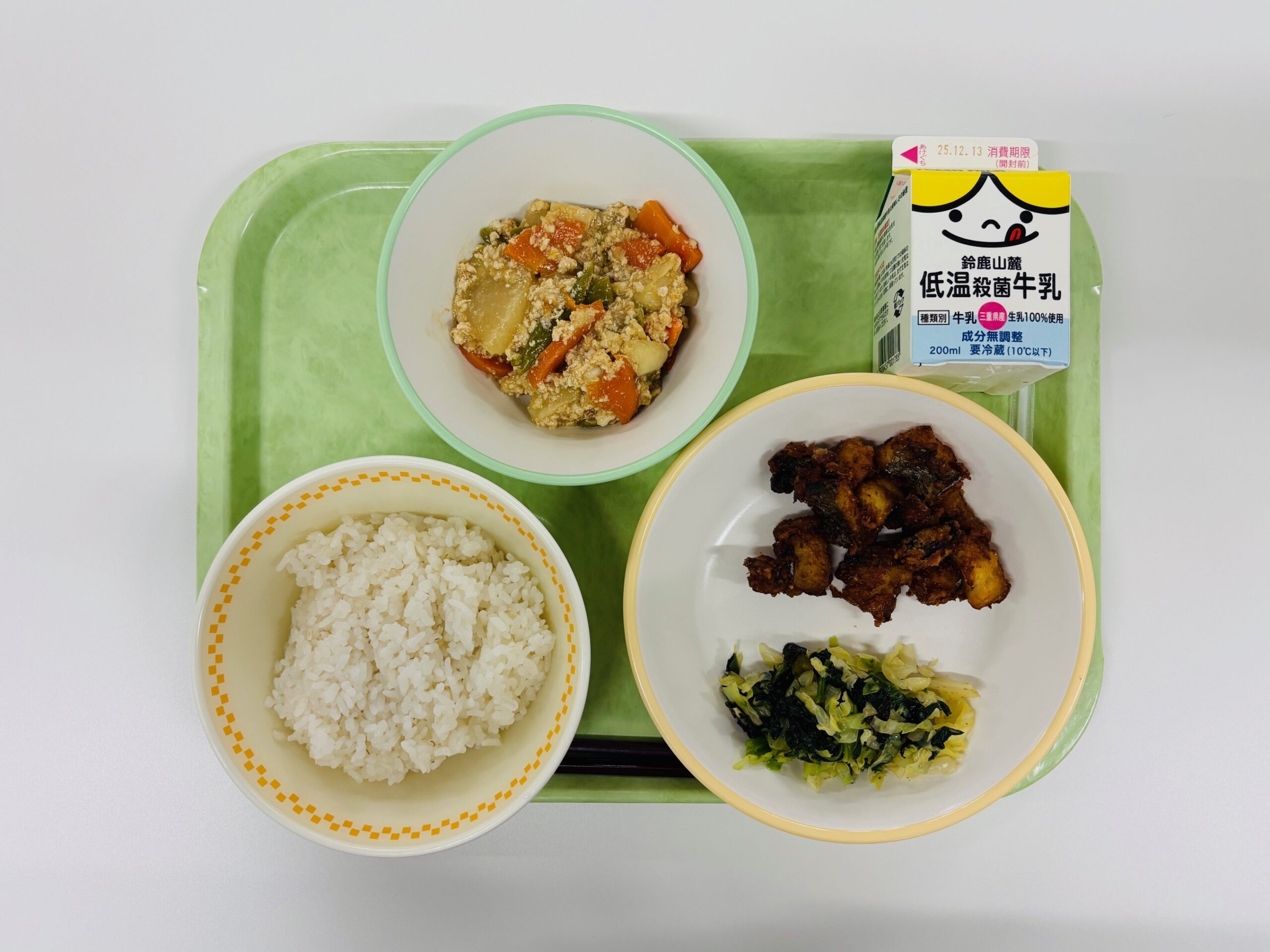 ほきの香味あげ、のりあえ、大根と里いものそぼろ煮、米飯、牛乳