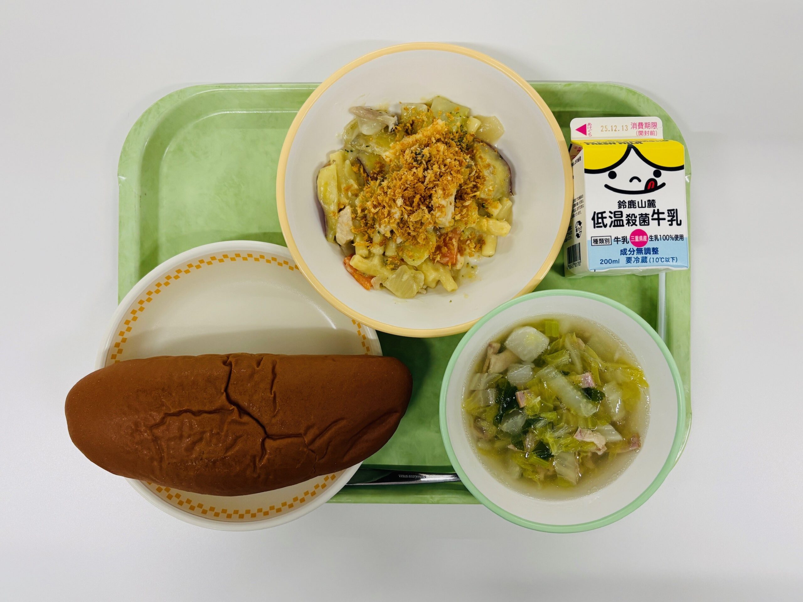 さつまいもの豆乳グラタン風、白菜とかぶのスープ、黒糖パン、牛乳