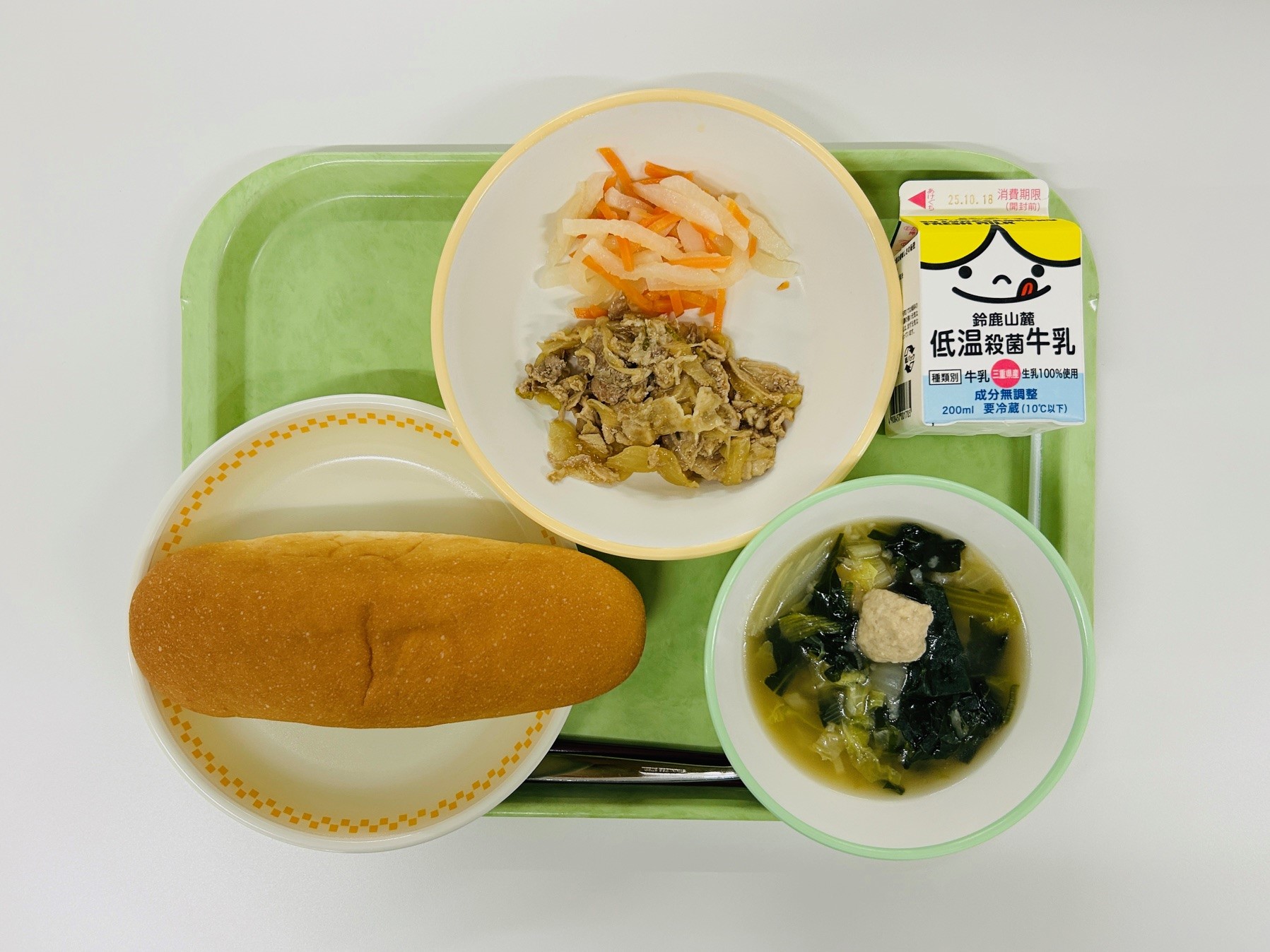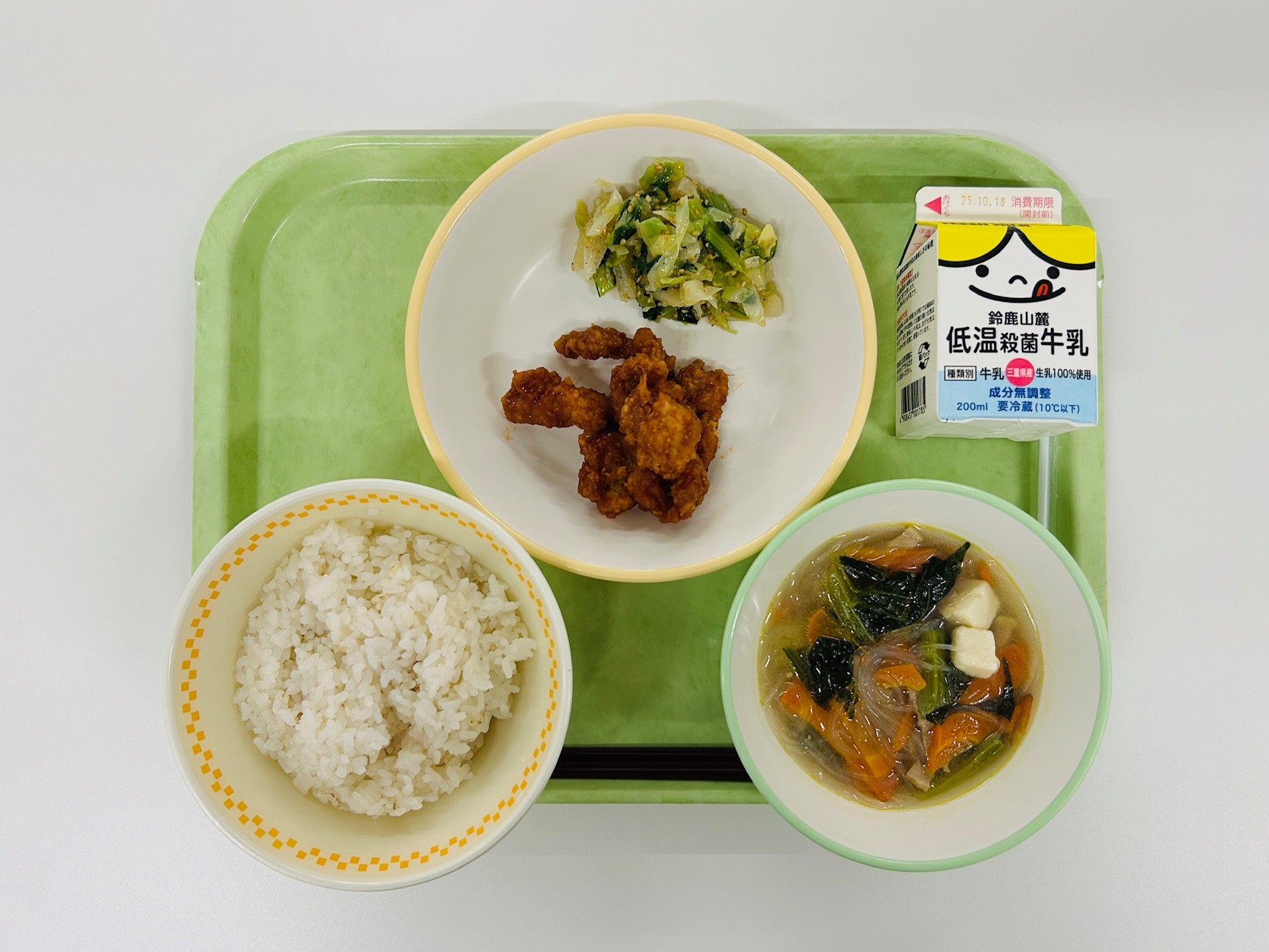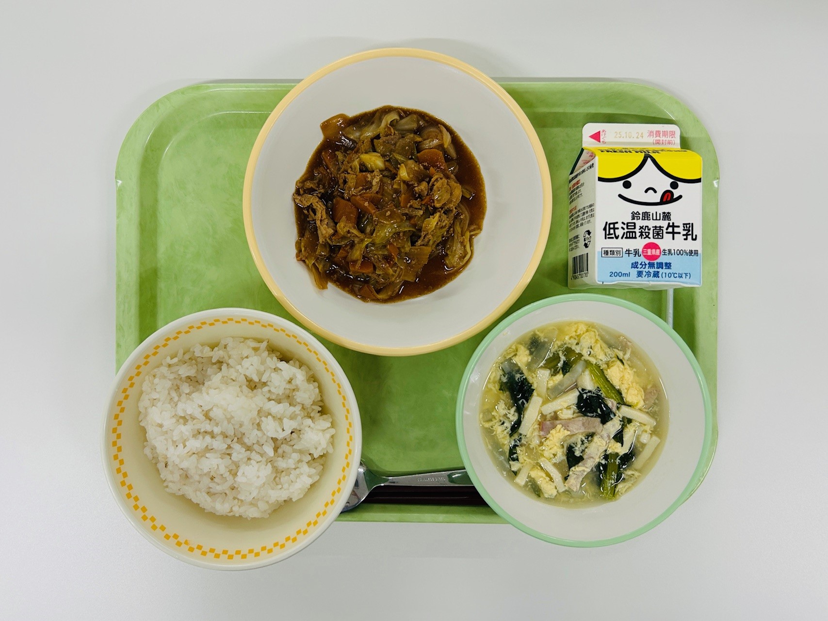 ホイコーロウ、中華風たまごスープ、米飯、牛乳