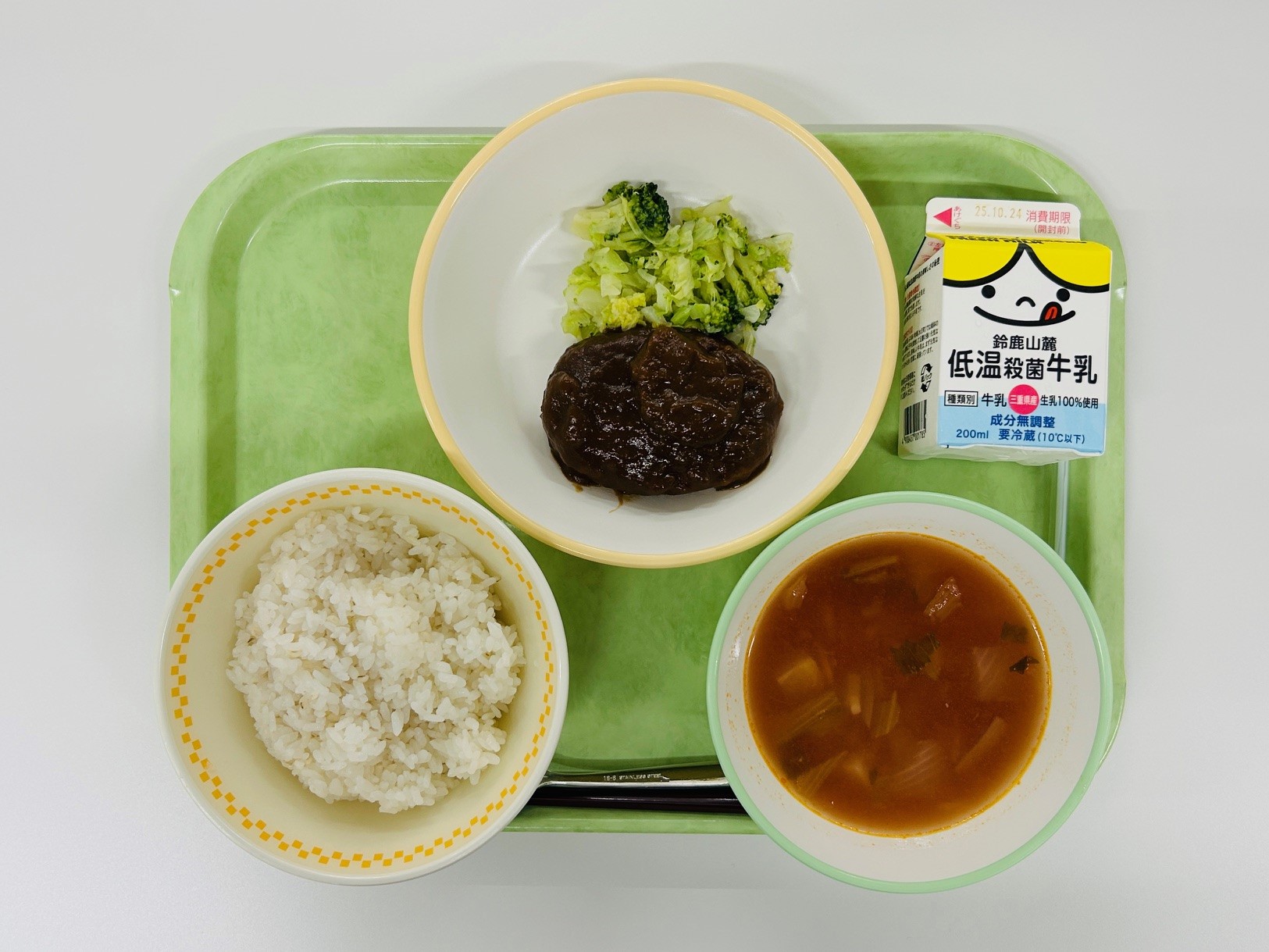 ハンバーグハヤシソース、ゆで野菜、ミネストローネ、米飯、牛乳