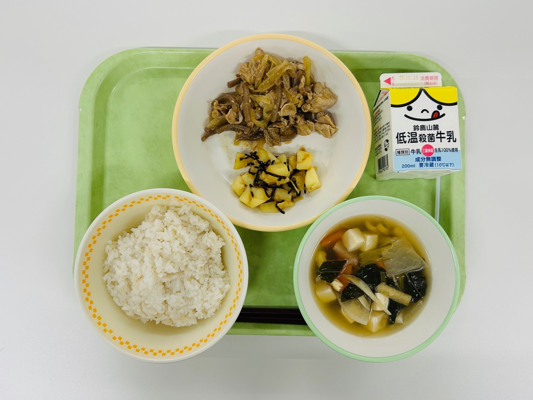 豚肉のしょうが炒め、じゃがいものこんぶあえ、けんちん汁、米飯、牛乳
