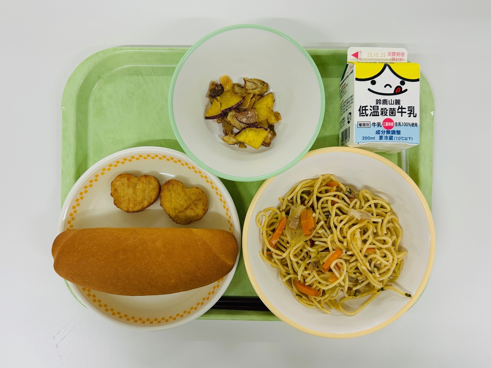和風スパゲティ、チキンナゲット、ベジタブルチップス、小型ミルクパン、牛乳