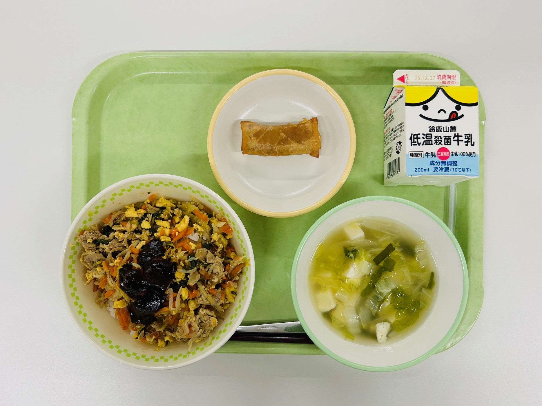 ビビンバ、春巻、豆腐とにらのスープ、牛乳